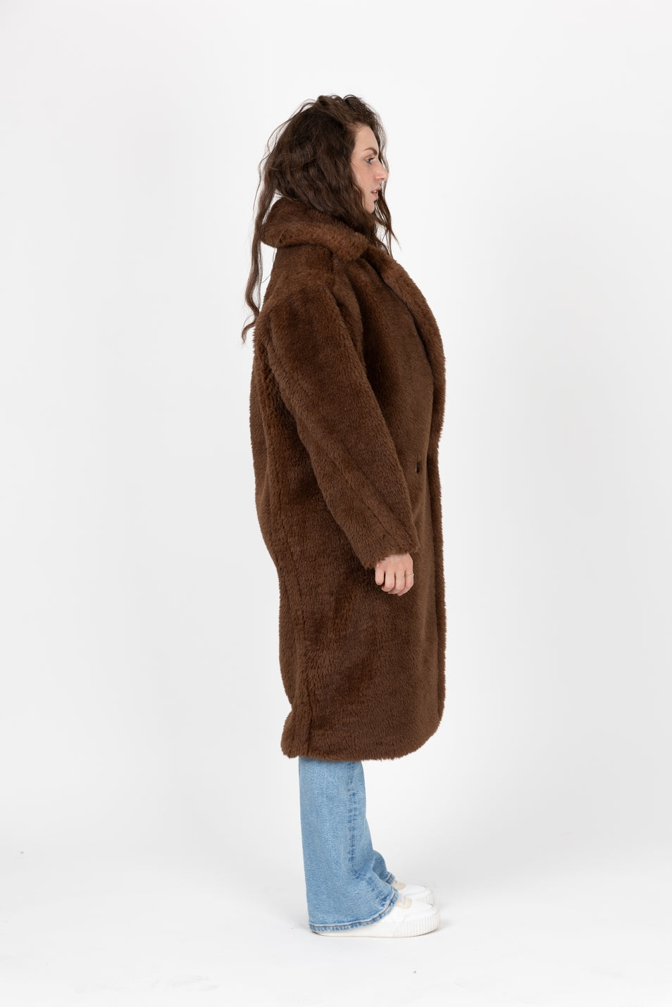 Wrap yourself in a cocoon of warmth with our long faux fur teddy coat. Its large protective collar and soft material ensure optimal comfort in cold weather.