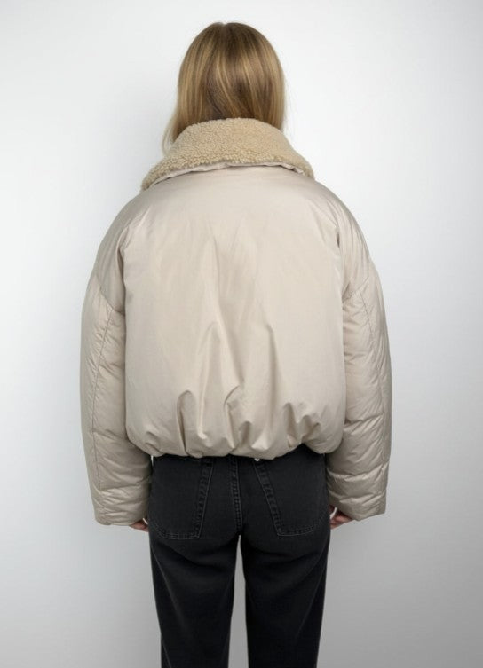 Ideal for cold days, this short puffer jacket combines style and comfort. Its contrasting faux shearling collar adds a chic and original touch, while its trendy cut enhances your silhouette. Warm, it's the perfect piece for a winter look that is both elegant and casual.