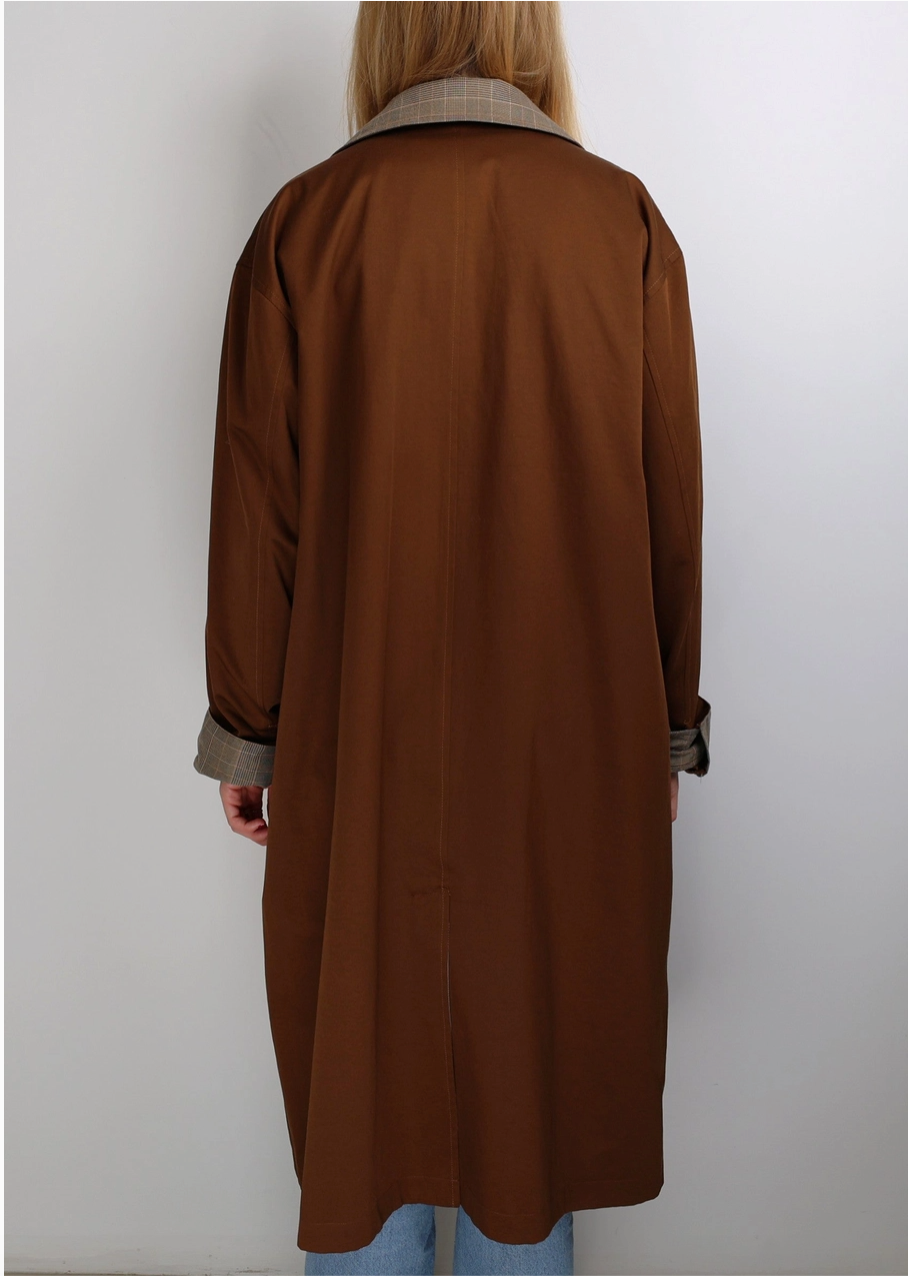 Our reversible women's trench coat is an elegant and practical piece that adapts to all your desires. On one side, a trendy check pattern for a bold and sophisticated look. On the other, a classic and timeless plain trench for a chic appearance in any circumstance. Its long cut highlights your silhouette. Ideal for the season, this 2-in-1 trench is the perfect ally for an impeccable style.