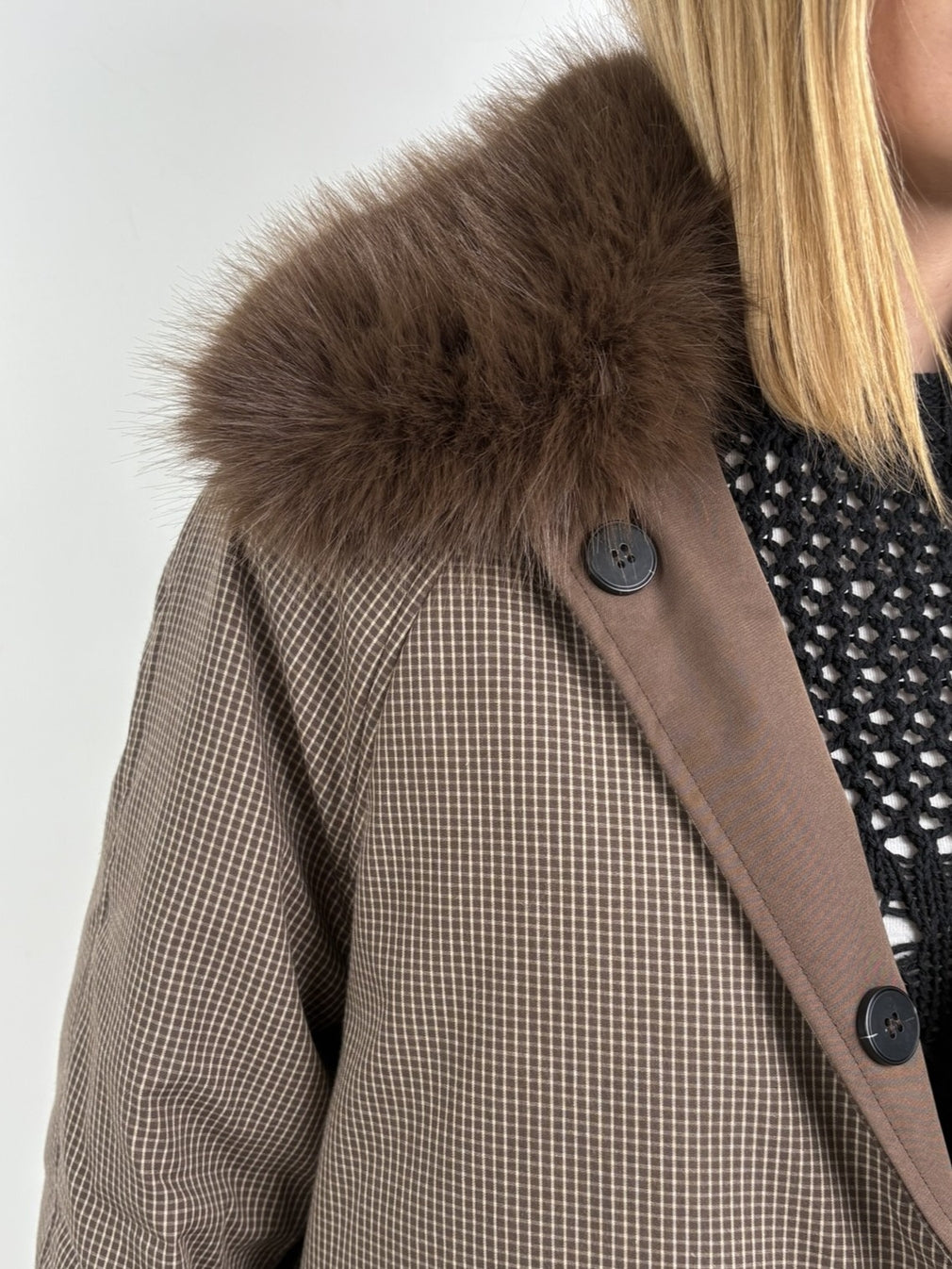 Our reversible coat for women is an elegant and practical piece that adapts to all your desires. On one side, a small check pattern for a bold look. On the other, a timeless plain coat for any occasion. Its removable faux fur collar and inner padding provide comfort and warmth. This 2-in-1 coat is the perfect ally for the season.