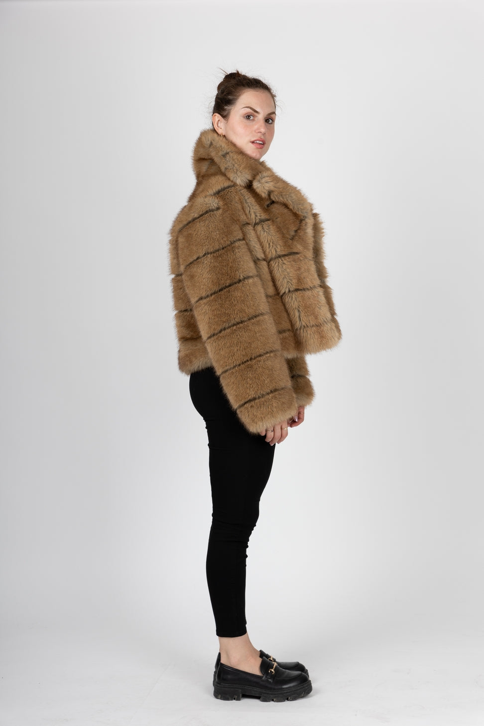Assert your uniqueness with our short faux fur coat featuring a trendy horizontal stripe cut-out effect. Boasting premium quality, it has an ultra-soft faux suede interior and fur finishes that make it an exceptional garment. Whether for a casual daily look or a sophisticated evening outfit, this coat ensures a unique and refined style.